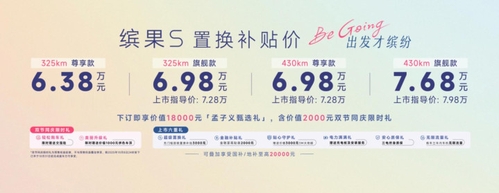 缤果S一共出了四款配置,不管你想要325km续航还是430km续航,都有尊享款和旗舰款可选,指导价从6.68万到7.98万不等。要是家里有旧车想置换,补贴完之后门槛更低,6.38万就能起步,最高也才7.68万,而且还能叠加上国家和地方给的购车补贴,最多能省2万块,这么算下来性价比确实很能打。