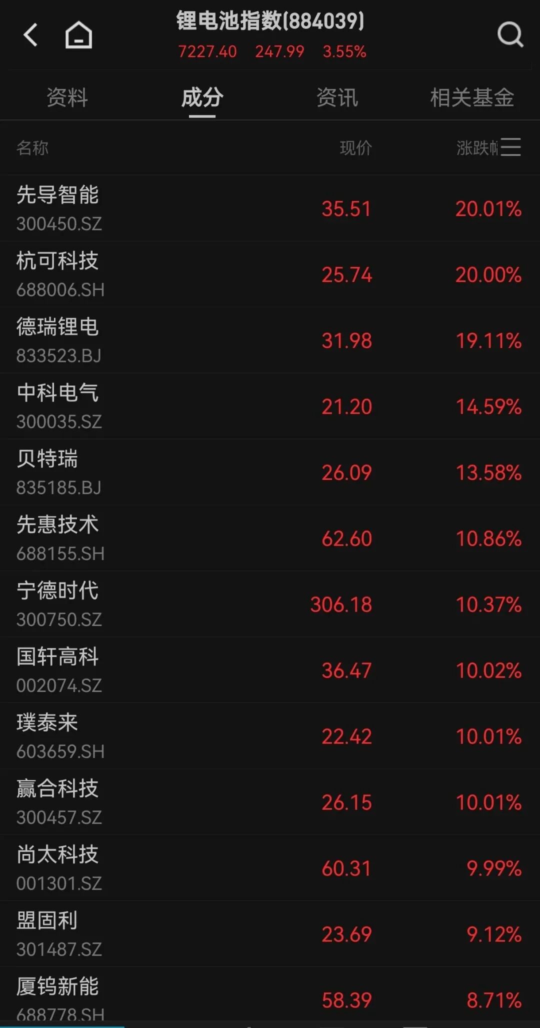 在芯片股回调的情况下,今日资金抱团锂电池板块,多只个股实现涨停。其中,先导智能、杭可科技实现20%涨停,德瑞锂电、贝特瑞、中科电气、宁德时代等上涨超10%,国轩高科、璞泰来等实现10%涨停。