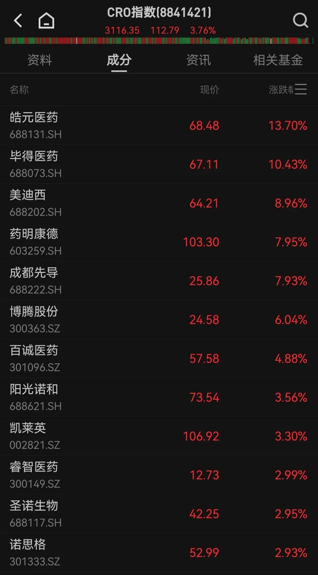 在经历了前期调整后,创新药板块今日有所反弹,药明康德、成都先导、美迪西等涨幅较高。