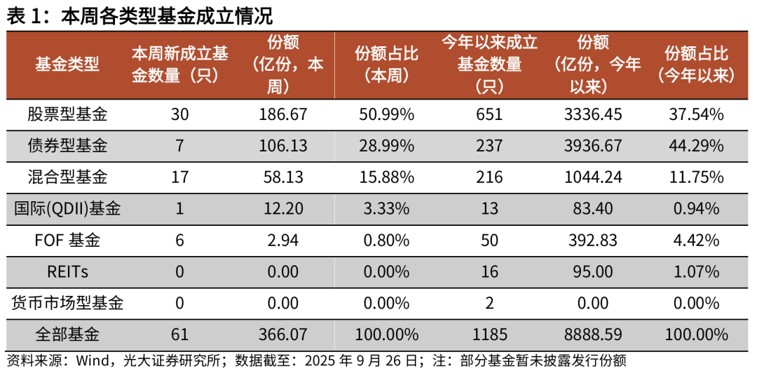 本周国内新基市场热度持续,新成立基金61只,合计发行份额为366.07亿份。其中股票型基金30只、债券型基金7只、混合型基金17只、国际(QDII)基金1只、FOF基金6只。本周新成立基金发行份额最大的是贝莱德中债投资优选绿色指数A(025117.OF),发行份额为60.0亿份,贝莱德中债投资优选绿色指数A为债券型基金。