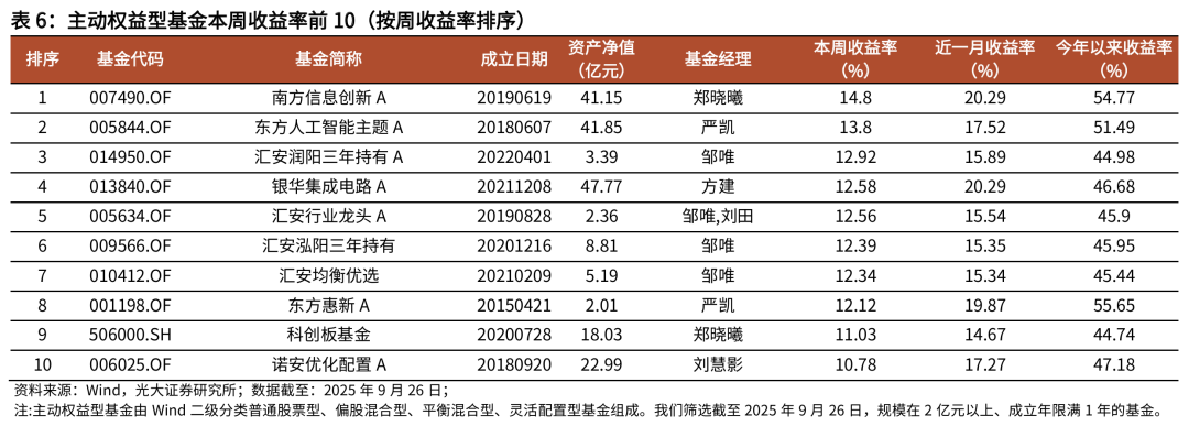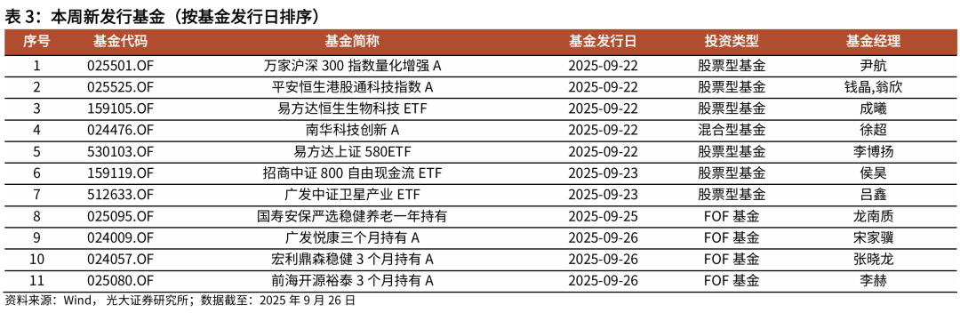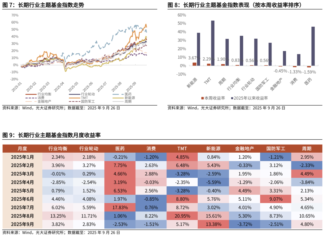 基金产品表现跟踪:长期行业主题基金指数表现来看,本周新能源、TMT主题基金净值涨幅占优,医药主题基金净值持续回撤。截至2025年9月26日,新能源、TMT、周期、行业均衡、行业轮动、国防军工、金融地产、消费、医药主题基金本周涨跌幅分别为3.67%、2.29%、1.90%、0.83%、0.56%、0.56%、-0.45%、-1.33%、-1.59%。