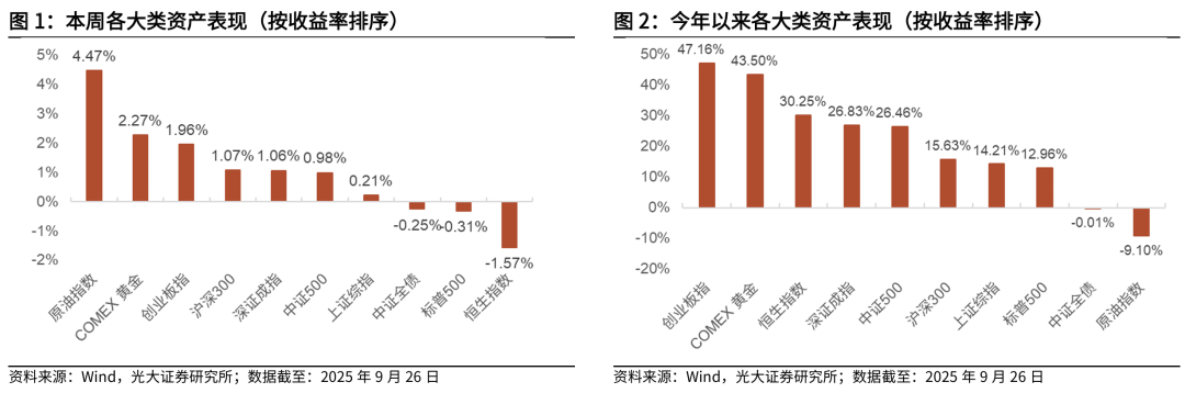 大类资产方面,本周(下文如无特殊说明,本周均指代2025.9.22-2025.9.26)原油价格大涨,国内权益市场指数普遍上涨,港股回调。具体来看,原油指数上涨4.47%、COMEX 黄金上涨2.27%、创业板指上涨1.96%、沪深300上涨1.07%、深证成指上涨1.06%、中证500上涨0.98%、上证综指上涨0.21%、中证全债下跌0.25%、标普500下跌0.31%、恒生指数下跌1.57%。
