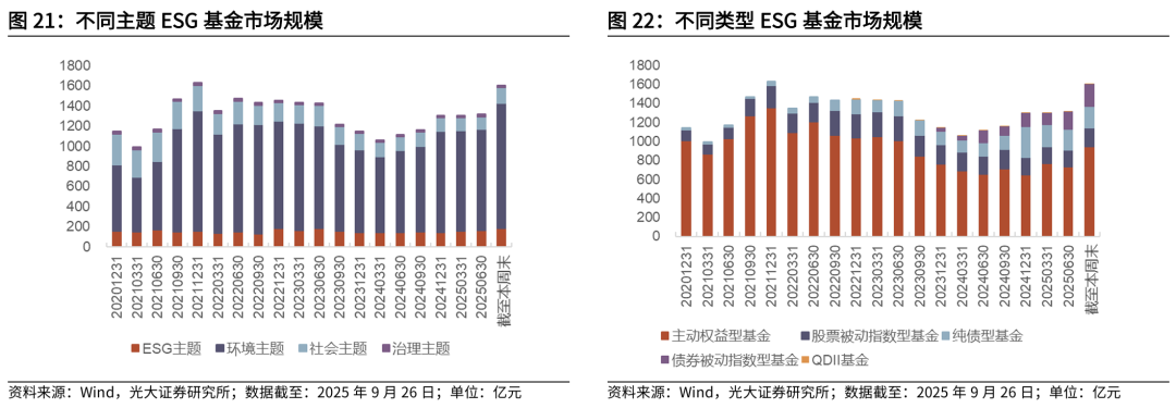 截至2025年9月26日,国内基金市场存量ESG基金共214只,规模合计1604.79亿元。分不同主题来看,ESG基金以环境主题基金为主,ESG主题、环境主题、社会主题、治理主题基金规模分别合计185.05、1240.64、154.46、24.64亿元。分不同类型来看,债券型基金在ESG基金中的占比逐渐提升,主动权益型、股票被动指数型、纯债型、债券被动指数型、QDII型ESG基金规模分别合计942.51、202.54、221.54、232.16、6.03亿元。