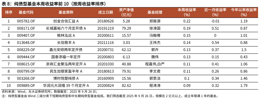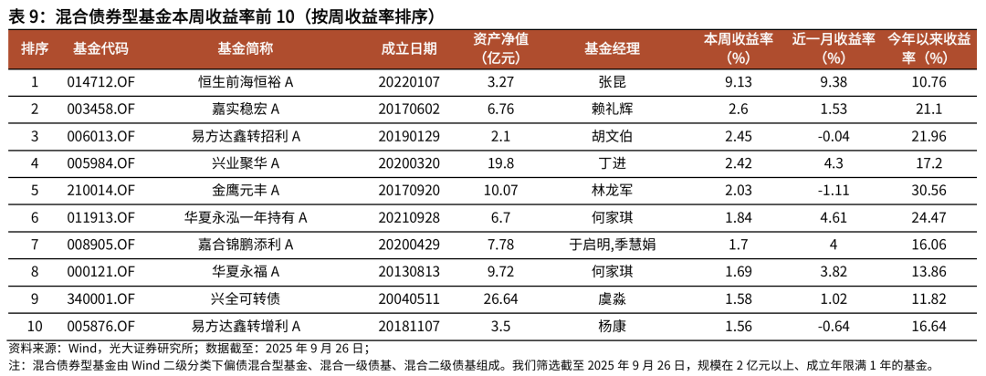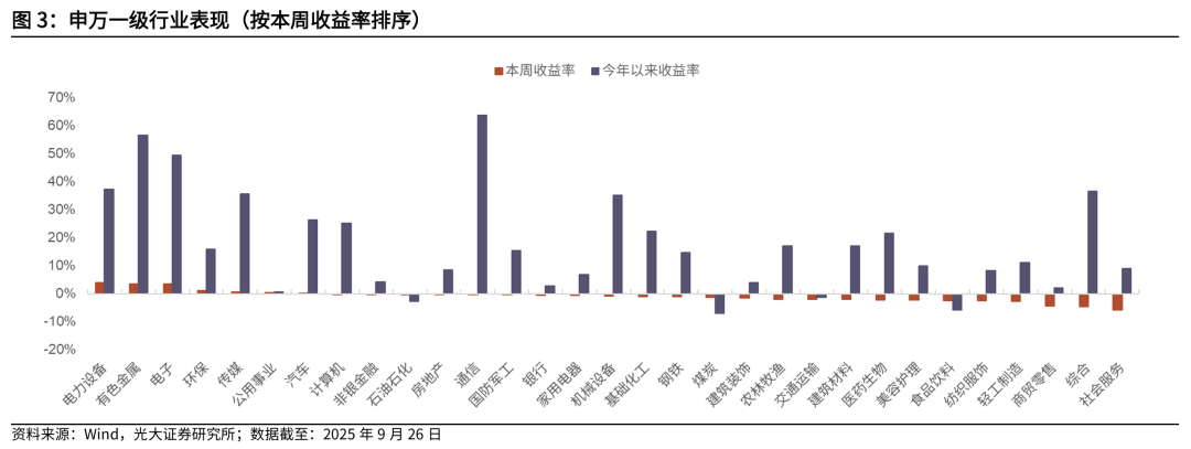 ]article_adlist-->摘要 ]article_adlist-->市场表现综述:大类资产方面,本周(下文如无特殊说明,本周均指代2025.9.22-2025.9.26)原油价格大涨,国内权益市场指数普遍上涨,港股回调。行业方面,本周电力设备、有色金属、电子行业涨幅居前,社会服务、综合、商贸零售行业跌幅居前。基金市场方面,本周权益基金表现较好,纯债型基金业绩回撤。