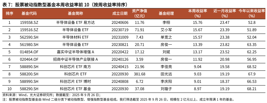 股票被动指数型基金的净值涨跌幅中位数为0.86%。其中净值表现最好的五只基金分别是半导体设备ETF易方达(159558.SZ)、半导体设备ETF(159516.SZ)、半导体材料ETF(562590.SH)、半导体设备ETF(561980.SH)、嘉实中证半导体增强A(014854.OF),一周净值涨跌幅分别是15.76%、15.67%、15.57%、13.39%、13.17%。