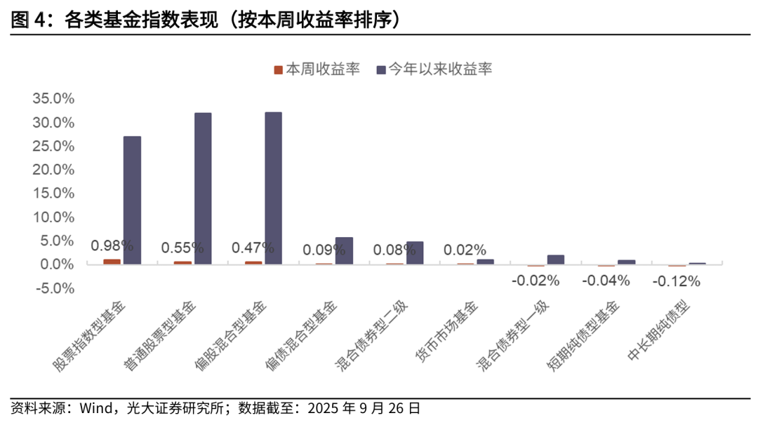 基金市场方面,本周权益基金表现较好,纯债型基金业绩回撤。从本周表现看,股票指数型基金、普通股票型基金、偏股混合型基金、偏债混合型基金、混合债券型二级、货币市场基金、混合债券型一级、短期纯债型基金、中长期纯债型基金涨跌幅分别为0.98%、0.55%、0.47%、0.09%、0.08%、0.02%、-0.02%、-0.04%、-0.12%。